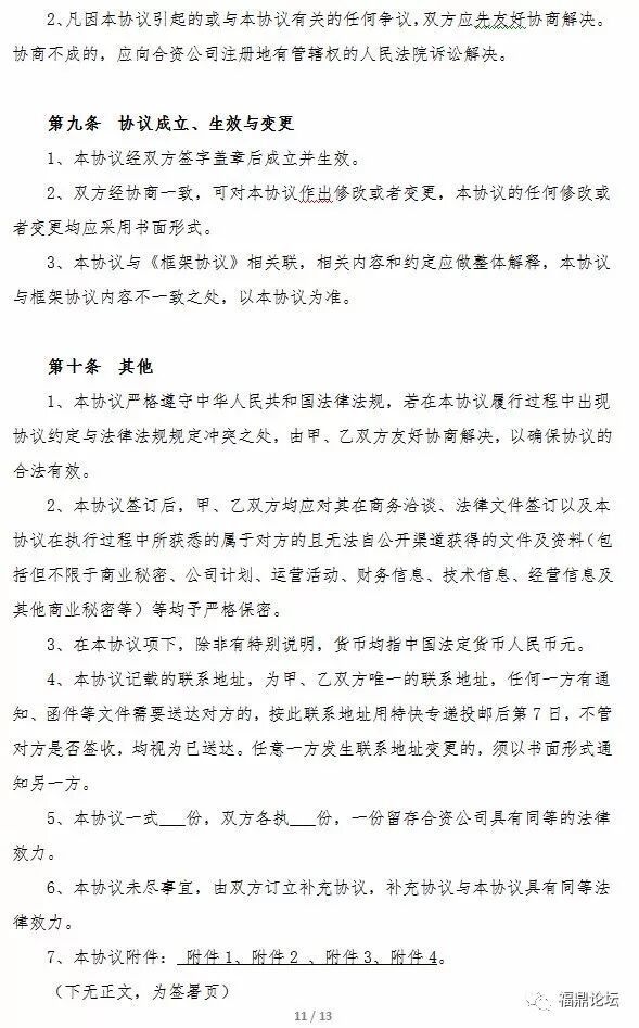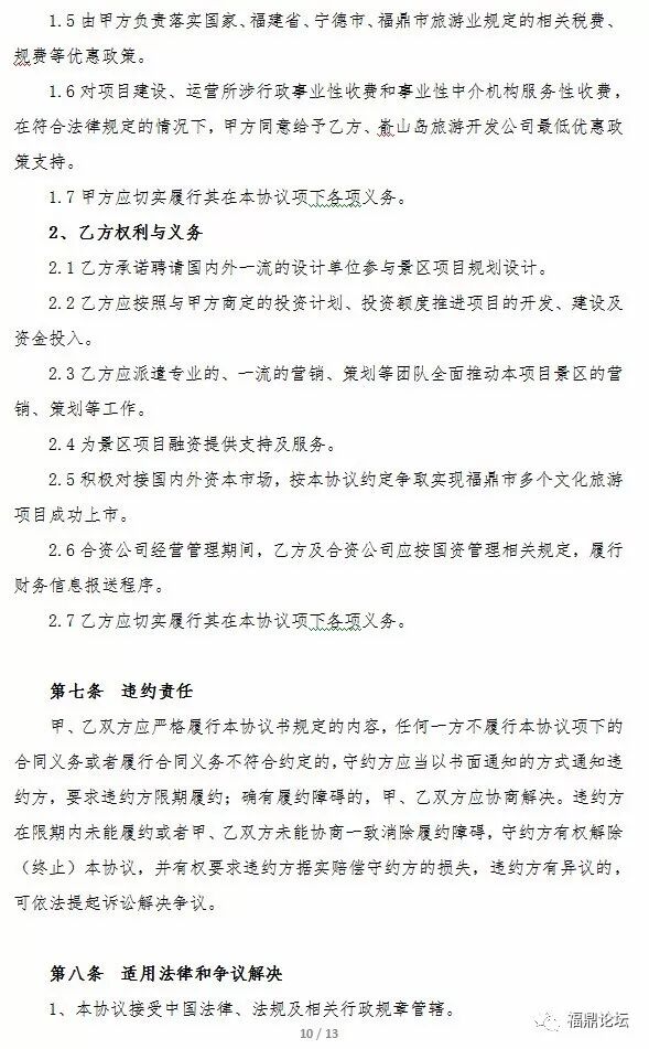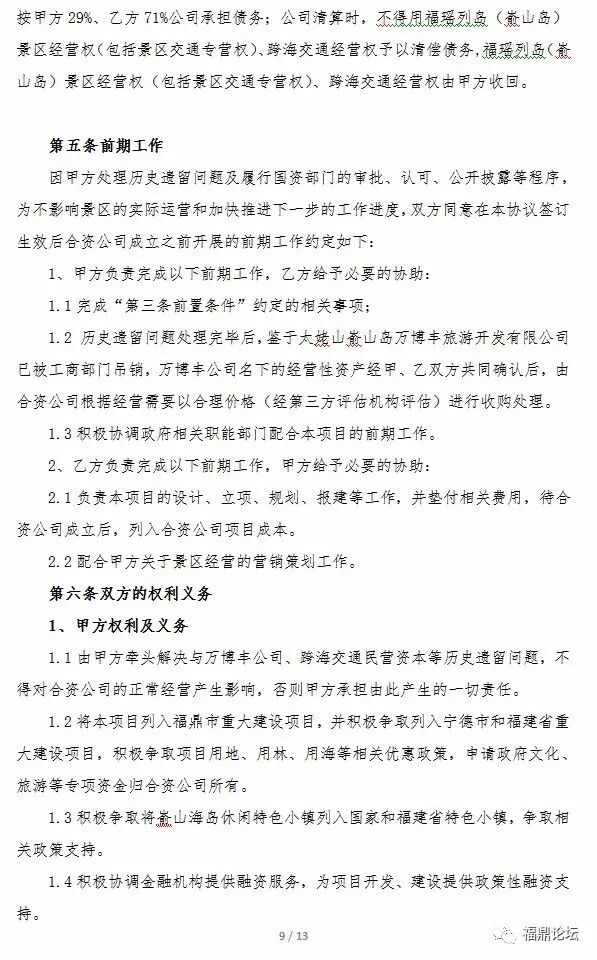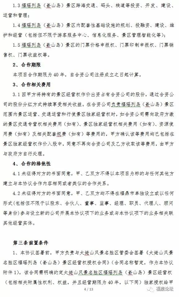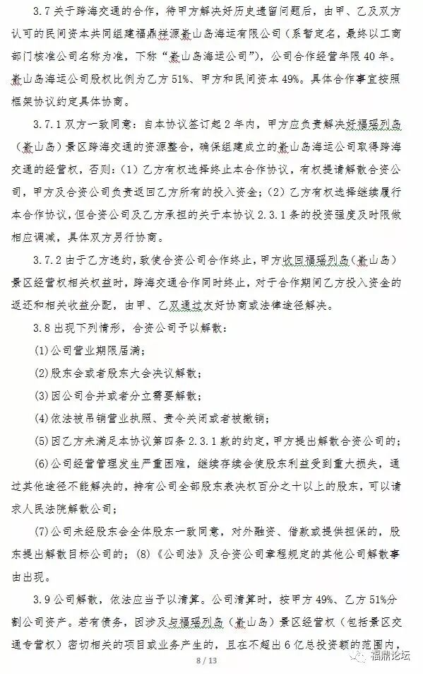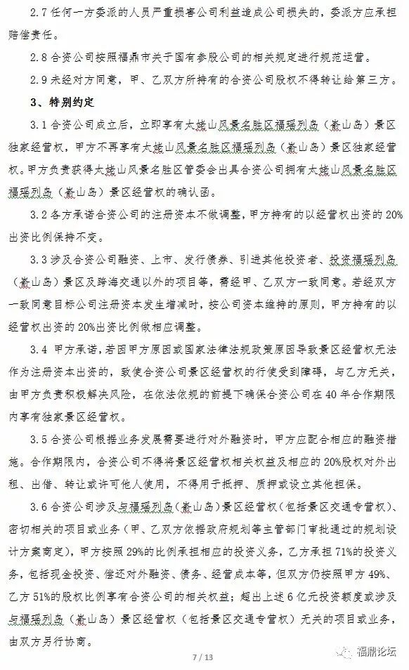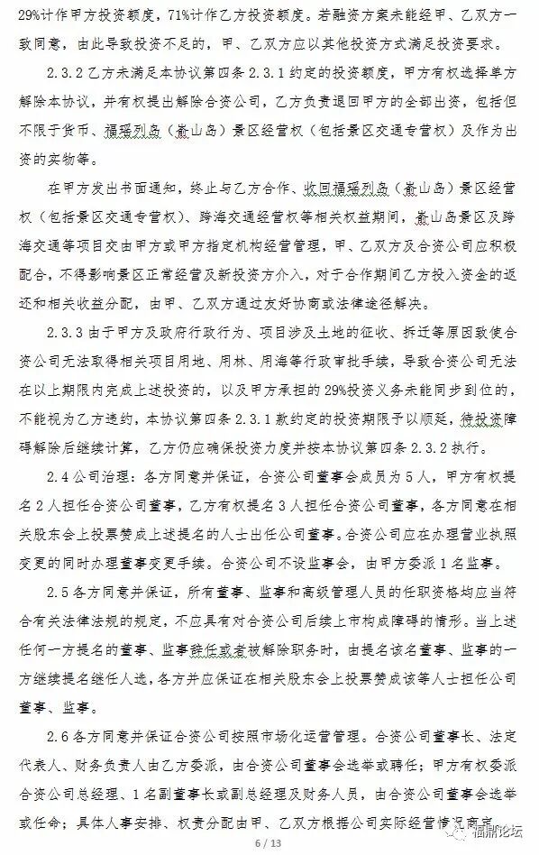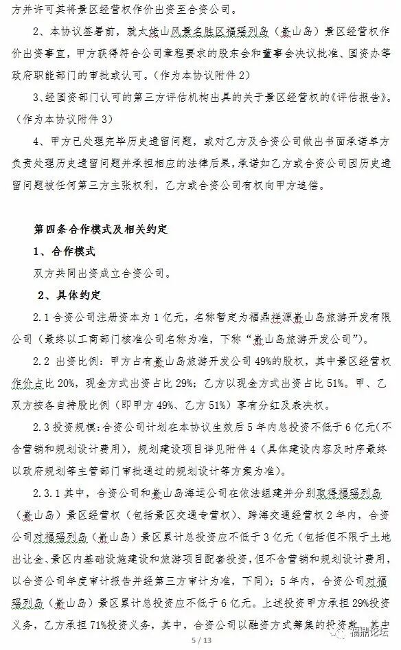 由旅游公司与太姥山祥源公司共同出资设立太姥山祥源嵛山岛旅游开发有限公司(暂定名),公司合作经营年限40年,注册资本暂定1亿元,其中太姥山祥源公司以现金出资51%;旅游公司以其拥有的福瑶列岛(嵛山岛)景区独家经营权作价入股,占嵛山岛旅游开发公司注册资本的20%;旅游公司以经第三方机构评估确认现有嵛山岛景区净资产及双方认可的景区合作范围内其他经营性资产及现金出资占比29%;相关出资需符合国有资产、工商等主管部门的要求,并履行相应审批手续。 嵛山岛旅游开发公司必须严格按照《太姥山风景名胜区总体规划》及相关法律、法规开发、建设福瑶列岛(嵛山岛)景区,并依法取得项目建设所需用地、用林、用海等审批手续。 由太姥山祥源公司、旅游公司及双方认可的民间资本共同组建太姥山祥源嵛山岛海运有限公司,公司合作经营年限40年,其中太姥山祥源公司现金出资51%、旅游公司和民间资本以三方认可的经营性资产及现金出资49%;公司合作经营期限内,通过合法、合规的方式取得嵛山岛景区跨海交通的经营权,经营权期限与嵛山岛海运公司合作经营期限相同。 嵛山岛旅游开发公司和嵛山岛海运公司在依法组建并分别取得福瑶列岛(嵛山岛)景区独家经营权相关权益(包括景区交通专营权)、跨海交通经营权2年内,对福瑶列岛(嵛山岛)景区及跨海交通累计总投资应不低于3亿元(含土地出让金、景区内基础设施建设和旅游项目配套投资,以嵛山岛旅游开发公司、嵛山岛海运公司年度审计报告并经第三方审计为准,下同);5年内,对福瑶列岛(嵛山岛)景区及跨海交通累计总投资应不低于6亿元。 太姥山祥源公司对旅游公司已设立的全资子公司“太姥山旅游交通服务公司”进行增资扩股,双方合作经营年限40年,其中太姥山祥源公司以现金出资占太姥山旅交公司的股权51%。旅游公司以其拥有的太姥山景区交通(含景区巴士、索道)独家经营权相关权益作价入股占太姥山旅交公司注册资本的20%;以增资扩股前的太姥山旅交公司净资产、三方认可的合作范围内其他资产及现金出资占29%。 在太姥山景区交通运输合作协议签订并生效后,由太姥山祥源公司成立的项目公司(下称“祥源营销公司”)就太姥山景区的营销、策划及品牌创建等工作与旅游公司开展合作,并由旅游公司与祥源营销公司签订具体营销合作协议,合作年限与太姥山景区交通运输合作年限(即40年)一致。 双方以10年为一个合作期,其中第一合作期以5年为一个阶段。前一个合作期满双方无异议的,自动进入第二个合作期。 第一合作期第一阶段,太姥山公司与祥源营销公司共同制定年度营销方案及工作计划,以合作协议签订前三年太姥山景区门票销售收入(均为不含景区交通收入,下同)平均值为基数。祥源营销公司自合作协议签订后第二年起,每年太姥山景区门票销售收入较合作基数实现不低于10%的递增目标,若祥源营销公司连续三年无法完成上述递增目标或第一阶段累计增幅低于30%的,太姥山公司有权解除与祥源营销公司的营销合作协议。 第一合作期第一阶段太姥山景区门票销售收入基数及自第2年至第5年每年5%的递增增量收入作为年度保底门票收入归太姥山公司所有,不足部分由祥源营销公司补足。第2年至第3年超过5%递增增量部分的70%收入由太姥山公司以营销奖励或收入分成等方式支付给祥源营销公司,30%归太姥山公司所有。第4年至第5年超过5%递增增量部分的60%收入由太姥山公司以营销奖励或收入分成等方式支付给祥源营销公司,40%归太姥山公司所有。 第一合作期第一阶段年度营销成本以年度保底门票收入12%计提,由太姥山公司支付给祥源营销公司,并由祥源营销公司全权使用。超出营销成本的营销费用由祥源营销公司承担。 在祥源营销公司顺利完成合作初期保底指标后,后续合作保底门票收入年均增幅不高于合作初期年度门票保底收入增幅。后续年度门票收入增量部分的分成,祥源营销公司获得的分成比例不低于50%。 太姥山民俗风情小镇计划总投资15亿元,由太姥山祥源公司或者其下属公司自主投资,在太姥山景区索道项目开始建设之日起2年内,太姥山祥源公司或者其下属公司就太姥山民俗风情小镇项目投资总金额不低于5亿元(含土地出让金、小镇基础设施建设、旅游项目投资和旅游地产配套开发等,下同),5年内投资总金额不低于10亿元,否则旅游公司有权追究祥源控股集团或者其所属公司的违约责任,直至终止太姥山景区交通运输合作,收回太姥山景区交通(含索道)独家经营权。 在福鼎市人民政府、太姥山管委会完成太姥山景区索道选址、报批等工作后15日内,太姥山祥源公司或者其下属公司启动太姥山民俗风情小镇规划、设计等工作;在太姥山景区索道项目相关审批手续完成之日起90日内,太姥山祥源公司或者其下属公司应完成太姥山民俗风情小镇项目土地受让(如因政府土地出让时间延迟除外),并启动项目开发、建设。 ● ● ●