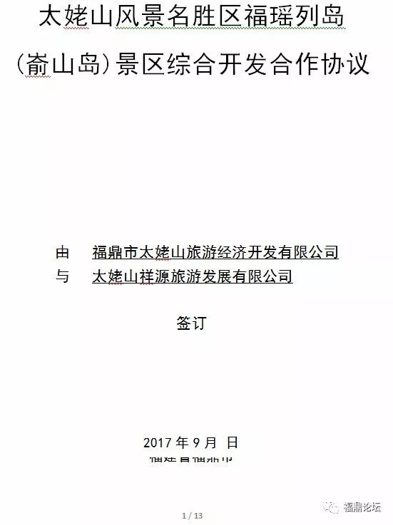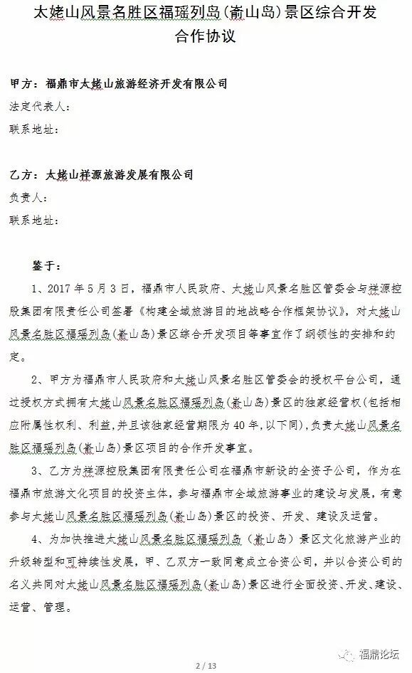 为深入开发太姥山风景名胜区旅游资源,做大做强福鼎市文化旅游产业,实现福鼎市全域旅游目的地的战略目标,遵循公开、公平、公正的原则,福鼎市人民政府授权福鼎市太姥山旅游经济开发有限公司(下称“旅游公司”)面向社会招商,引进合格的投资者。通过竞争性洽谈磋商,经市委专题会议、市政府常务会议、市委常委会讨论通过,拟选定祥源控股集团有限责任公司(下称“祥源集团”)作为合作方,并于2017年5月3日签订《构建全域旅游目的地战略合作框架协议》。协议签订后,旅游公司与祥源集团就框架协议确定的合作内容及《太姥山风景名胜区福瑶列岛(嵛山岛)景区综合开发合作协议》、《太姥山风景名胜区太姥山景区交通与索道建设运营合作暨福鼎市太姥山旅游交通服务有限公司增资扩股协议》、《太姥山风景名胜区太姥山景区旅游营销合作协议》三份具体合作协议进行了多轮磋商,并经公司股东会议同意后报请市政府常务会议通过,现将合作主要内容及合作协议对外进行公示: