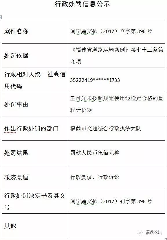 公示闽宁鼎交执(2017)罚字第396号 行政 / 处罚 / 信息