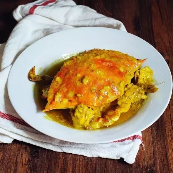 材料: 螃蟹、西芹、葱、香菜、红辣椒、洋葱、咖喱粉、酱油、椰奶、水。 做法: 1. 将螃蟹处理好,去除腮等不能食用的部分,洗净后切块备用,西芹摘去叶子,洗净后斜切成段备用,洋葱也切丝备用; 2. 起油锅,将螃蟹块醮上少许面粉放入锅中,炒熟至外表呈金黄后捞出备用; 3. 将锅烧热,加入洋葱、红辣椒炒香,加入咖喱炒至咖喱香味散出后,再倒入炸好的螃蟹块、西芹段、葱段,加入酱油、椰奶,炒熟后装盘,撒上香菜末即可。