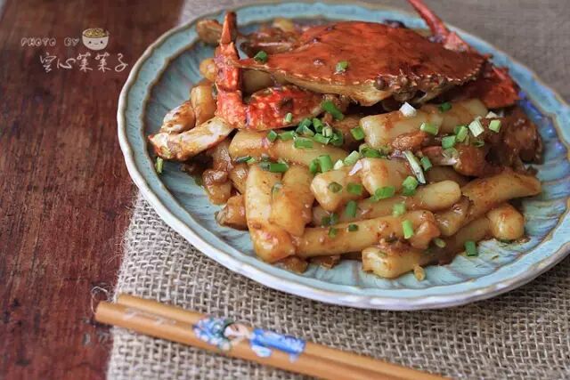 蟹一只、年糕四两、姜丝、葱丝、料酒、酱油、糖、盐 做法: 1. 把螃蟹剁成四份; 2. 年糕先在开水里烫一下,让它软化; 3. 锅中放油,放入葱姜丝煸炒出香味; 4. 倒入螃蟹大火快炒,同时放料酒,放酱油、糖爆炒,最后放入年糕翻炒几下放入少量盐,就可以出锅了。