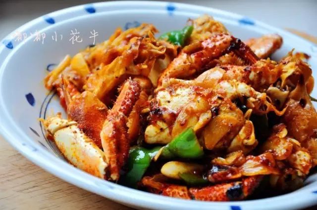 材料: 活肉蟹、干辣椒、花椒、姜、蒜、葱、盐、胡椒粉、料酒、淀粉、海鲜酱、水淀汾、鸡精、香油、花椒油、辣椒油、香菜。 做法: 1、肉蟹从腹脐处取壳,去净内脏及鳃叶,宰去腿尖及壳沿,洗净后,将蟹斩成八块,加入适量精盐,料酒拌匀; 2、锅置旺火上,至五成油温,然后将蟹块斩口处粘裹上干细淀粉,入油锅内浸炸至熟(蟹壳同时成熟); 3、锅内另加油,烧至四成油温,投入干辣椒节,花椒炒香,掺入鲜汤,略烧片刻,再下姜、葱蒜、海蟹,最后放入精盐、料酒、海鲜酱、鸡精烧约2分钟后,用水淀粉收薄芡,最后加入香油、花椒油、辣椒油、胡椒粉翻匀即可装盘。
